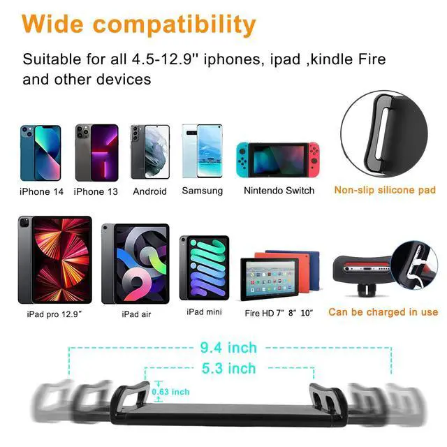 It works with various tablets and mobile devices ranging from 4.5 to 12.9 inch-screen, including iPad mini, iPad, iPad Air, iPad Pro 12.9'', and many other tablets. For smartphones like iPhone7, 7plus, 8, 8plus, x, XR, xs, xs max, iPhone 11, 12, 13,14 series.Galaxy Tab,Fire 7, Fire HD 8, Fire HD 10, N- Switch and etc.