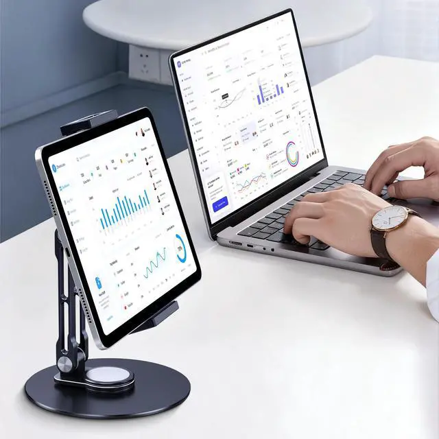 This adjustable ipad stand doubles as a reliable tablet stand for desk setups: its durable metal construction and stable design work seamlessly as an ipad stand for cooking tutorials, video conferences, or desk workflows.