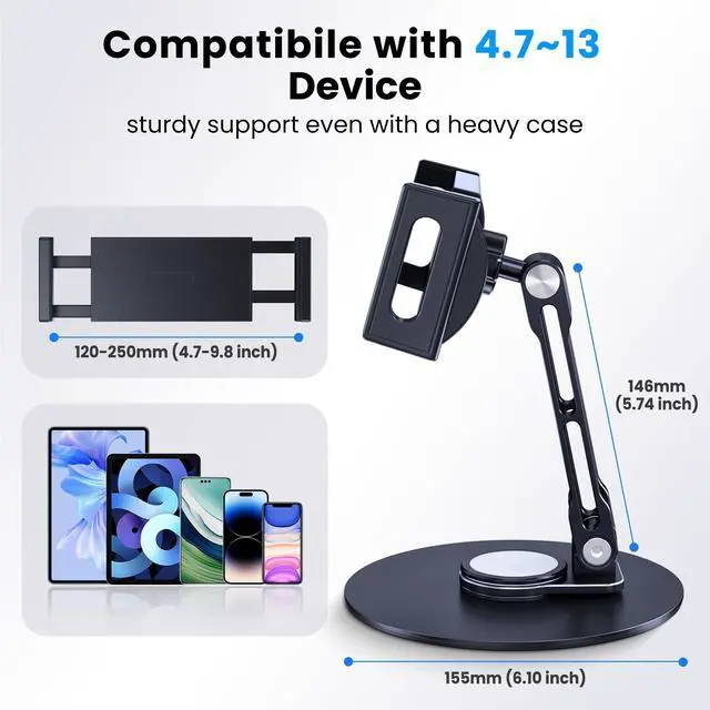 Upgrade your workspace with this versatile tablet stand for desk—the perfect ipad stand for hands-free productivity, streaming, or video calls! Designed to fit 4.7~13” tablets (including ipad pro stand, ipad mini stand) and smartphones, this heavy-duty tablet holder features 4 flexible rotating joints that let you tilt, swivel, and lock your device at any custom angle.