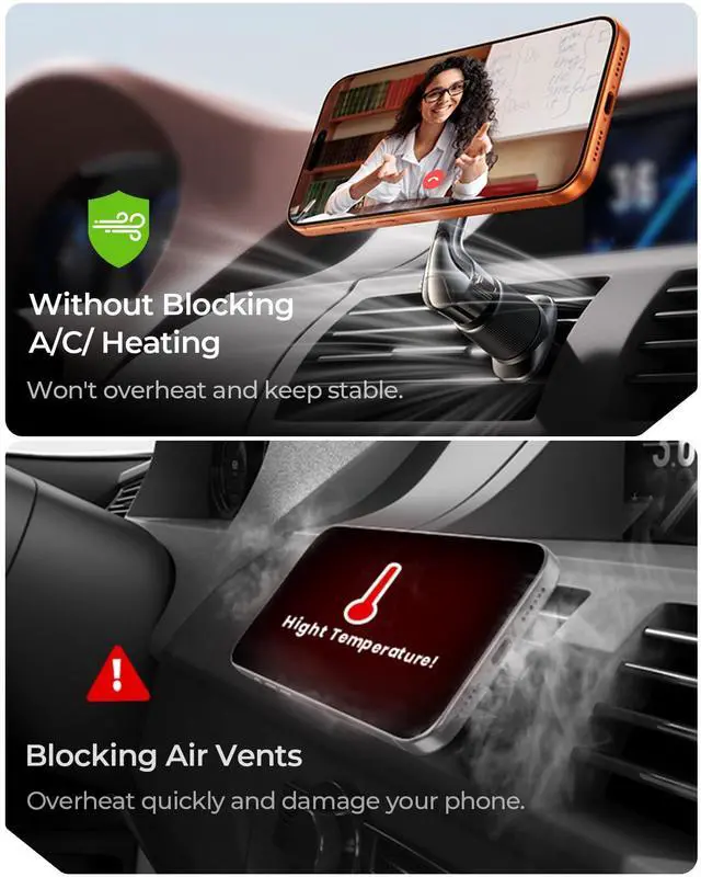 Upgrade Magsafe Car Air Vent Holder from three directions: 40*N52 magnets provide strong magnetic support to hold up to 10 iPhones 17 Pro Max; Metal double hooks with the most stable triangular structure design; Upgraded multi-adjustment function can help you find the best position for your car mount. Note: Magsafe car mount does not support charging function