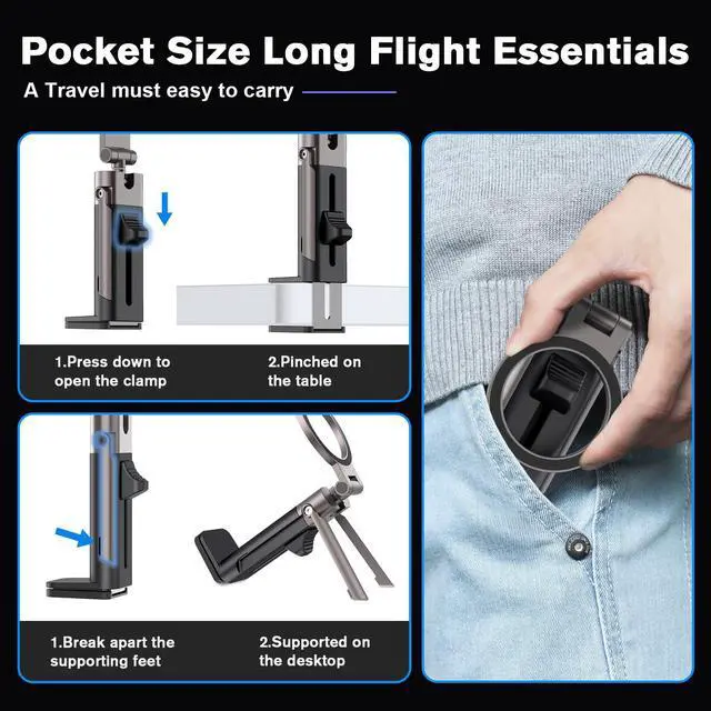 Compact pocket-sized design fits easily in bag. Purchasing this airplane travel mount virtually eliminates the need for multiple holders - its versatile clamping and freestanding functionality serves all your needs at home, on the road, and in travel,A travel must haves