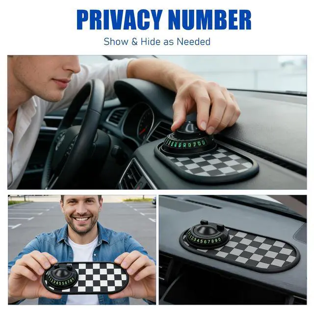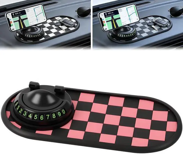 Antislip Phone Mat For CarThe 360 Degree Rotatable Car Phone Holder attaches to the Non-slip Dashboard Pad using adhesive tape. Its telescopic spring adapts to different phone thicknesses, And digital stickers are provided to customize your parking number plate
