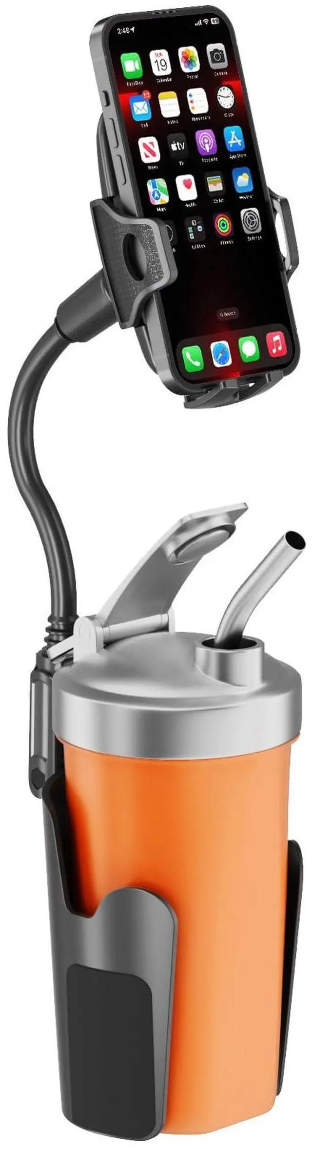 ADJUSTABLE ALUMINUM GOOSENECK - Cup holder phone holders gooseneck is forged from aluminum alloy, which is sturdy and durable and can better support the phone. The neck length can reach 8 inches, you can adjust the height and angle according to your needs.