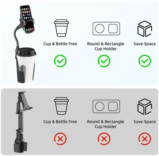 2-IN-1 SPACE SAVING: Different from other cup holder phone holders, it does not take up any space in the cup holder. The car cup holder adopts an integrated hollow design, suitable for various car models, while also freeing up space for water bottles or cups