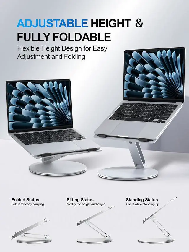 Adjustable Laptop Stand for Desk - 360° Rotating Ergonomic Riser with Aluminum Cooling Vents & Sturdy Construction for 10-16 Inch MacBook Pro/Air, Foldable Portable for Office & Home - Silver