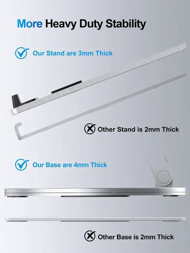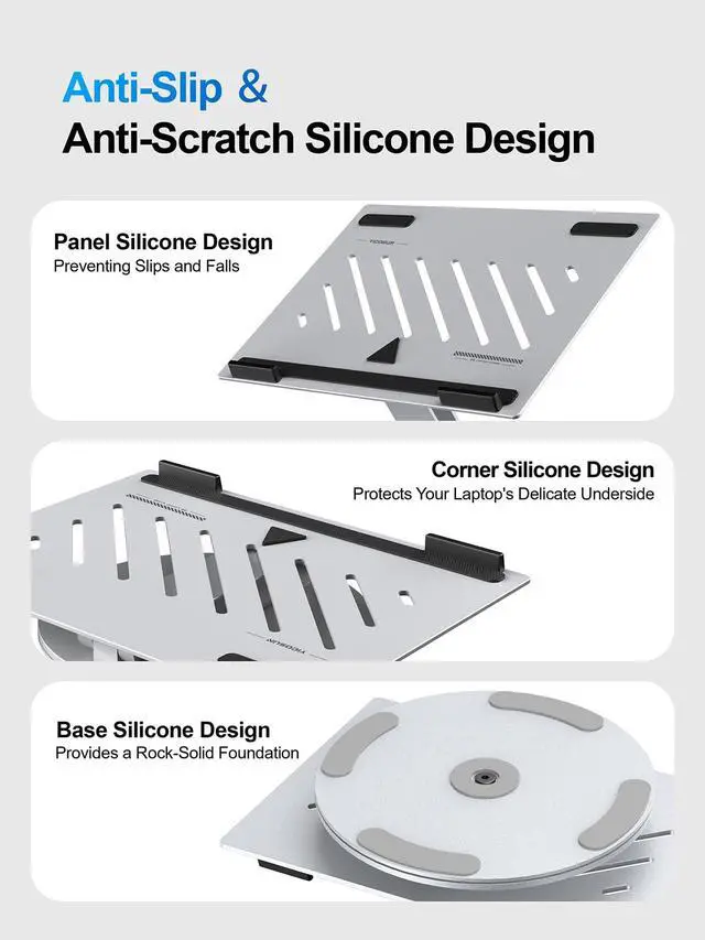 Enhanced Stability, Protection & Silent OperationConstructed from premium aluminum alloy, this folding computer holder for laptop ensures heavy duty stability with a large base to prevent wobbling or tipping. Its silent precision hinges enable noiseless repositioning - even during smooth folding adjustments - while non-slip silicone pads securely hold your notebook up to 22lbs, providing reliable scratch and slip resistance.