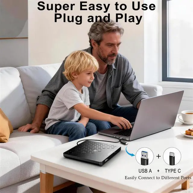 The USB-C /A data cable is fixed to the bottom of the external drive. Please turn the optical drive over, and you will find the data cable that connects to the computer.
