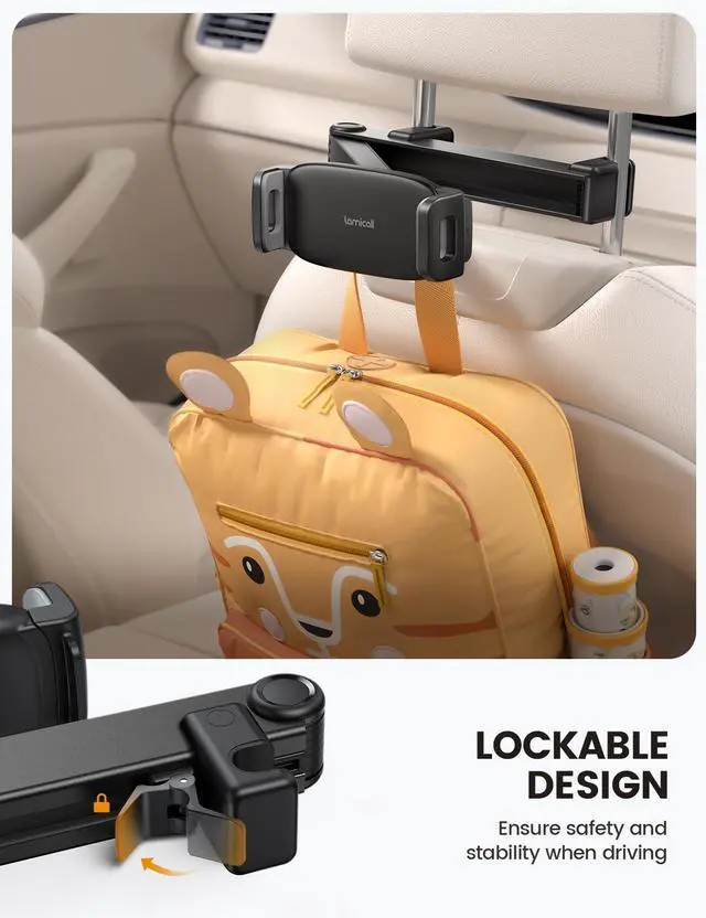 Super Stability - Unique Safety Lock & Metal Rod The headrest poles mount is made of high-quality metal and adds a metal buckle for a more secure lock on the headrest, greatly increase the stability during driving; And with rubber pads on the tablet clip to prevent the tablet free from scratches