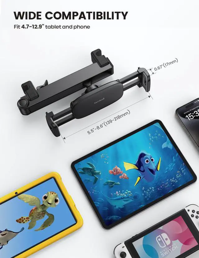 Devices Compatibility The universal headrest tablet holder is suitable for 4.7 - 13" devices, such as 2025/ 2024/ 2022 iPad Pro 13 inch, Pro 11, iPad Air 6, iPad Mini, Galaxy Tab, Kindle, Fire HD, iPhone Air, iPhone 17 Pro Max, 16, 15, 14, Galaxy S25 Ultra, more; The max thickness it can fit is 0.67" (17mm), the suitable width of the screen is 5.5 - 8.6", 4.7 - 13" refers to the diagonal length of the screen
