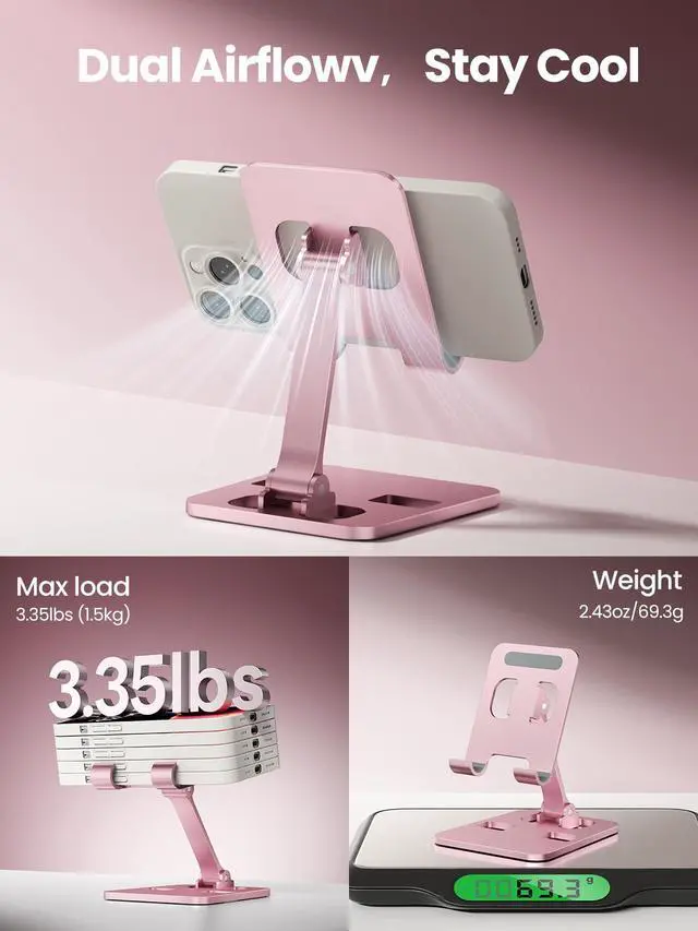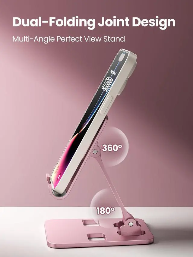 Phone Stand for Desk, Dual Folding Cell Phone Holder, Fully Adjustable Portable Mobile Phone Holder for iPhone 17 16 15 14 13 12 11 Pro Max Plus Air, Galaxy S25 S24, All Phones (Rose Gold)
