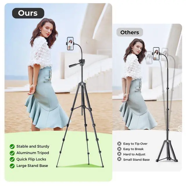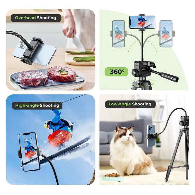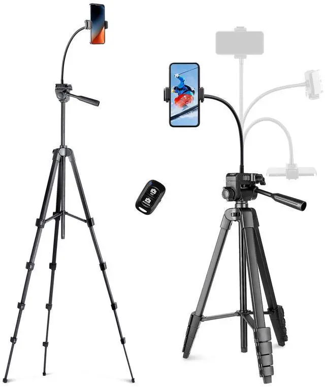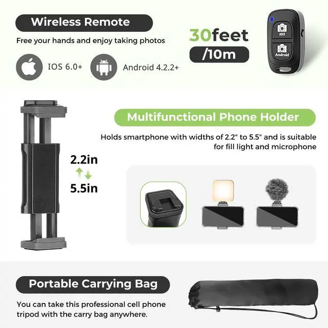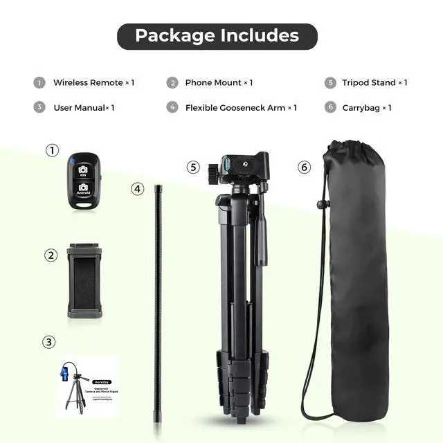Package includes 1 x tripod stand, 1 x phone mount, 1 x flexible gooseneck arm, 1 x wireless remote, 1 x carry bag, and 1 x user manual.