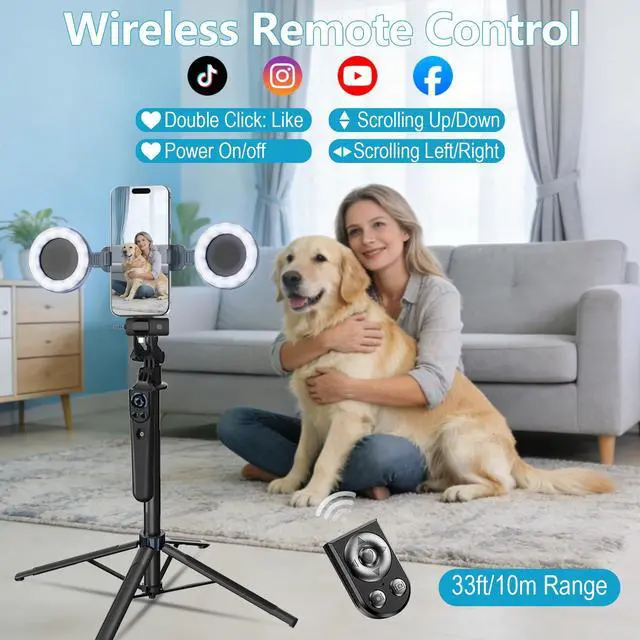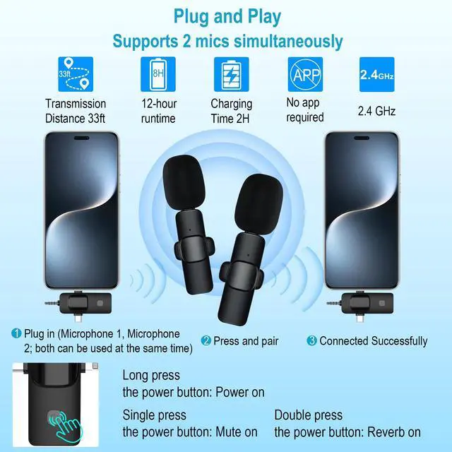Studio-Quality SoundOur cell phone tripod is equipped with two 3in1 professional lavalier mics for iPhone, Android and cameras. Charge 2 hours, recording 12 hours. With both USBC and Lightning adapters included, the mini mic connects instantlyno apps, no Bluetooth, just pure plugandplay performance, with a recording range of up to 79ft. It captures crystal-clear audio and cuts through background noise, even outdoors, thanks to the windshields like high-density foam and a dead cat cover.