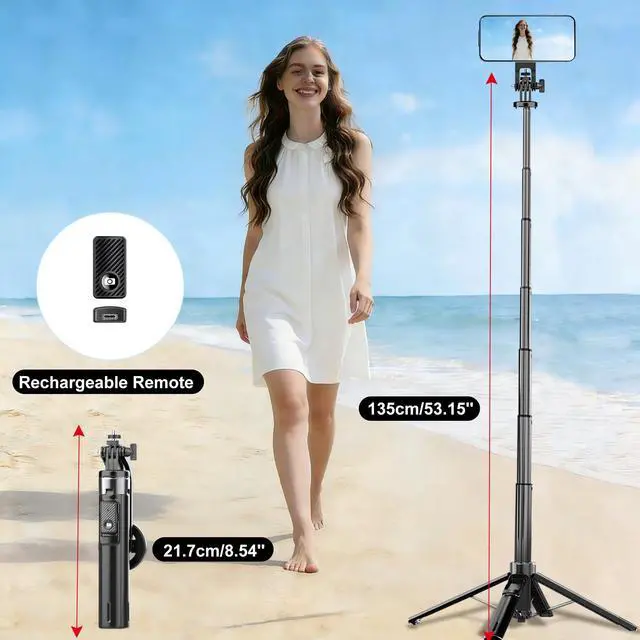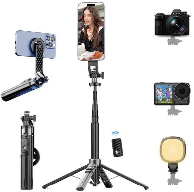 Magnetic Phone Tripod 53" Portable Selfie Stick for iPhone MagSafe GoPro Action Cameras with Rechargeable Remote Compatible with Android Travel Vlogging Live Streaming Content Creators
