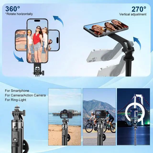 4-IN-1 MULTIFUNCTIONAL PORTABLE SELFIE STICK Compact and highly portable, this multifunctional selfie stick is perfect for outdoor travel shooting and professional photography enthusiastsit is compatible with all types of smartphones, and comes with a dedicated threaded mount that fits action cameras, DSLR cameras and ring fill lights, allowing one single product to meet multiple needs.