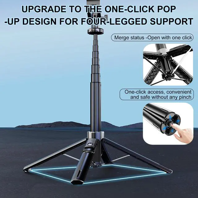 Reinforced Four-Leg Selfie StickUpgraded 4-leg support design, equipped with high-quality zinc alloy connecting rods and silicone non-slip foot pads, can firmly hold your phone or camera. This phone tripod ensures steady shots on any surface