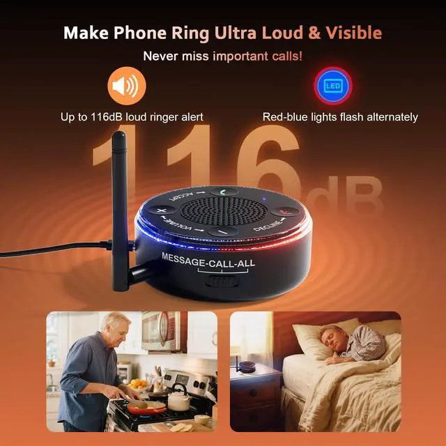Merchant VideoThis loud phone ringer combines 116dB ultra-loud audio and bright alternating red-blue flashes for powerful dual alerts—no more missed important calls. The flashes are daytime-visible, and 120dB sound cuts through home noise easily, solving missed calls from poor hearing or noisy spaces.