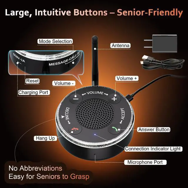 The smarthone ringer amplifier boasts large, intuitive "Accept" & "Decline" buttons with clear labels — no abbreviations, easy for seniors to read and operate. Answer or decline calls directly when your mobile phone is across the room, no more dashing to fetch it, ideal for seniors less tech-savvy.