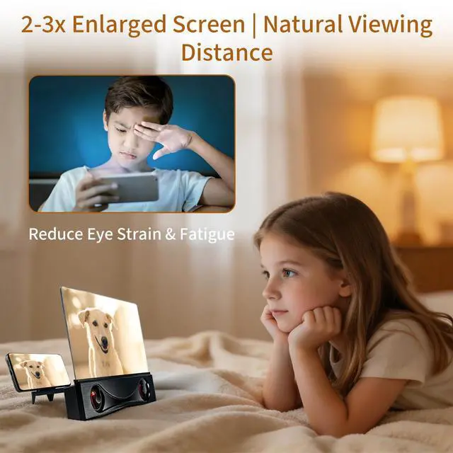 12" HD Lens Big Screen Comfort for All Ages The 12-inch HD optical lens magnifies your phone screen up to 3 times, turning squinting into relaxed viewing. Ideal for seniors reading messages, kids watching cartoons, or anyone settling in for a binge-watching session. Built-in anti-blue light technology reduces eye strain during long hours, making it a thoughtful choice for online learning and daily use.