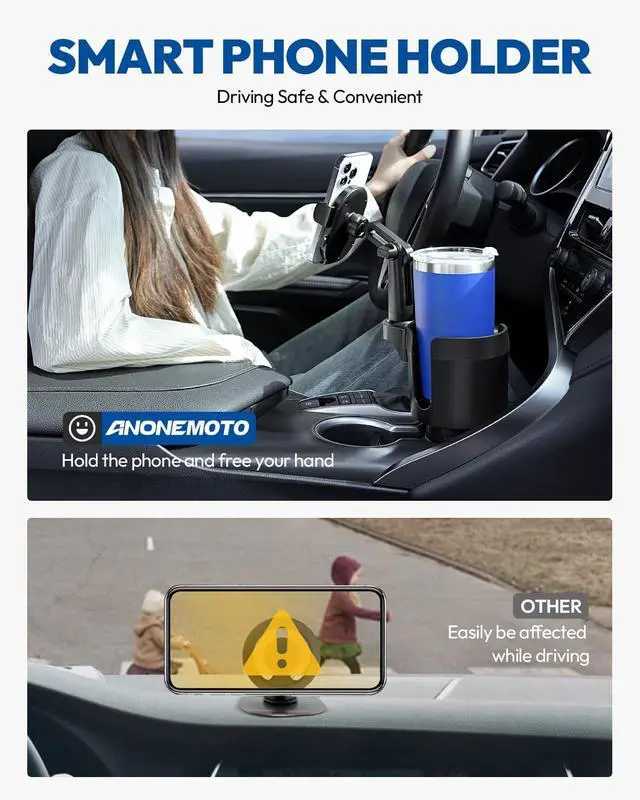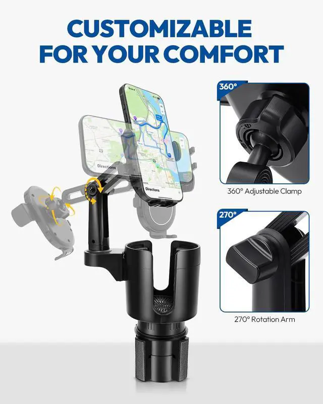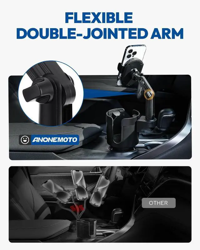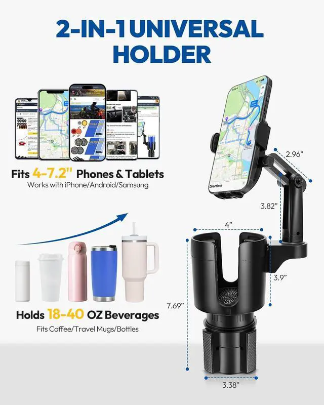 • Dual Function Design: Combines a car cup holder expander and phone mount, supporting large bottles (12-40 oz, up to 3.78" wide) and phones (4.0-7.0"). The adjustable base expands from 2.56" to 4.0" to fit most vehicle cup holders.