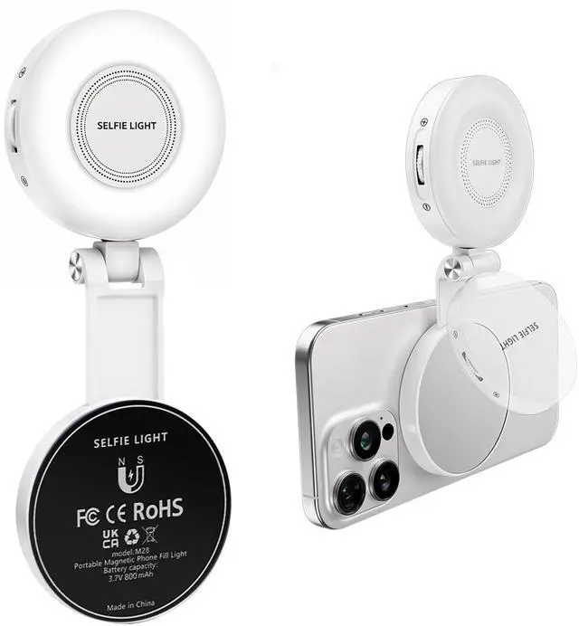 • Universal Magnetic Selfie Light With Mirror: Tomum Magnetic Selfie Light combines a bright LED fill light with a built-in makeup mirror, offering quick touch-ups and balanced lighting anywhere. The powerful rubidium magnet attaches instantly to MagSafe-compatible iPhones (12 series and above), Android or any cell phone using the included magnetic metal ring adapter. Designed for selfies, makeup, vlogging, and video recording, it ensures professional-quality results in every shot.
