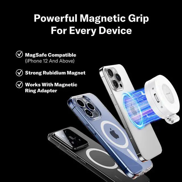 Equipped with a powerful rubidium magnet for instant MagSafe connection to iPhone 12 series and above. Also compatible with Android and other devices using the included magnetic ring adapter.