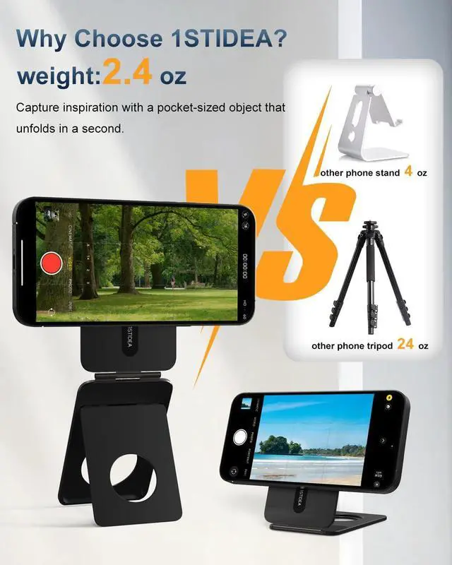 Compatibility: 1ST IDEA phone tripod stand compatible with iPhone 16 Pro Max, iPhone16 Pro, iPhone 16 Plus, iPhone 16, iPhone 15 Pro Max, iPhone15 Pro, iPhone 15 Plus, iPhone 15, iPhone 14 Pro Max, iPhone14 Pro, iPhone 14 Plus, iPhone 14, iPhone 13 Pro Max, iPhone 13 Pro, iPhone 13, iPhone 13 Mini, iPhone 12 Pro Max, iPhone 12 Pro, iPhone 12, iPhone 12 Mini, and compatible with MagSafe cases. Tripod iphone for non-MagSafe phones or cases with an included Metal Ring Inside the package