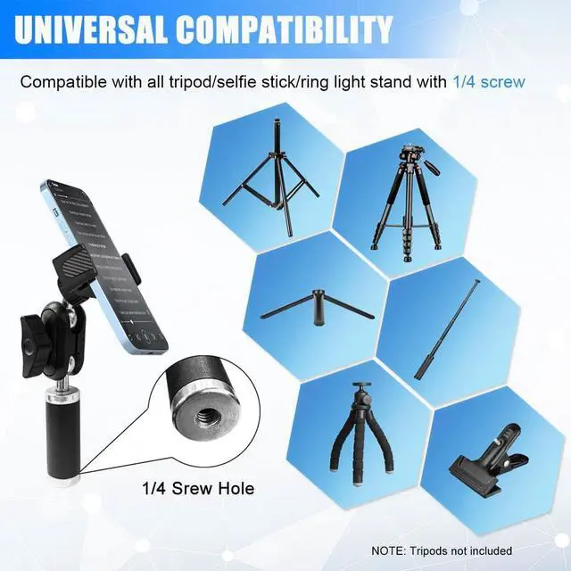 Hassle-Free SetupWith 1/4 screw hole, this phone holder for tripod attachment can be connected to different devices as needed; Works with various tripods, selfie sticks, and stabilizers; Perfect for selfies, photography, video recording, filming, vlogging, and more.