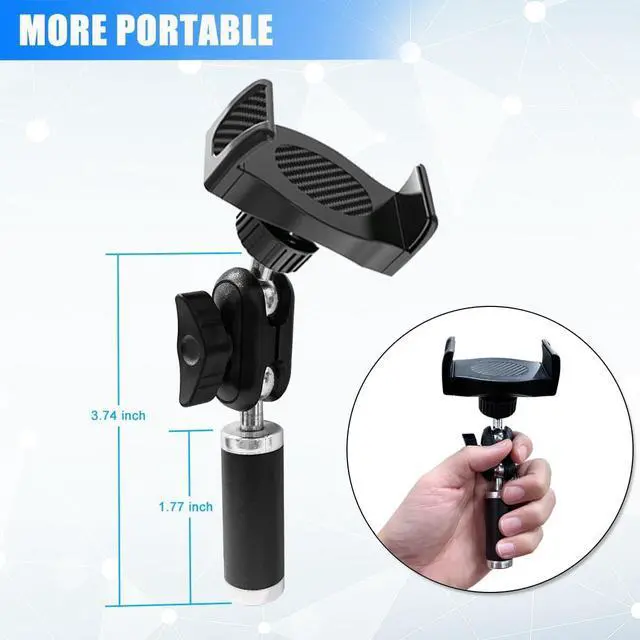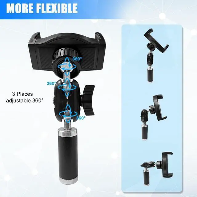 Infinite FlexibilityUpgraded three stainless steel ball heads supports 360° flexible rotation, and can be freely tilted by 180° and locked in place by means of an articulating knob, ensuring precise and almost instantaneous positioning of your phone. Whether its vertical, horizontal, overhead, or low-angle, this phone mount for tripod handles it all with ease.