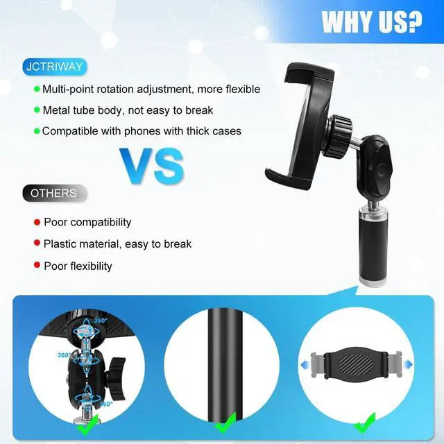 Upgraded Phone Holder for TripodJCTRIWAY upgraded smartphone tripod mount festures with articulating magic arm with three ball heads. Enjoy limitless adaptability with the freely adjustable 360-degree rotating phone holder, giving you versatile shooting angles.