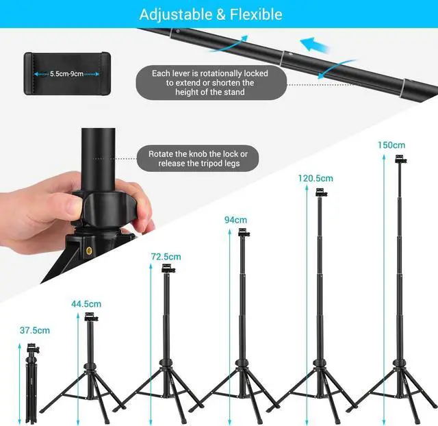 Wide Compatibility 0.5 kg / 1.1 lbs load capacity, universal 1/4 inch screw design and comes with a phone holder ( 5.5 cm-9 cm), this selfie stick stand can be used with a digital camera, mirrorless camera, action camera and most smartphones.