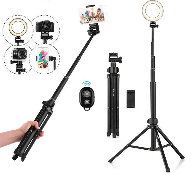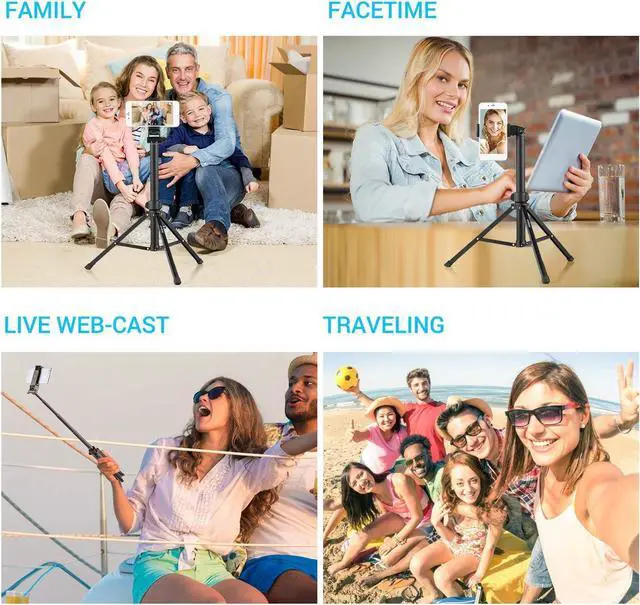 2-in-1 selfie stick + tripod Selfie stick + tripod 2-in-1, you can not only flexibly take a selfie with this stand, but you can also take photos or record videos by placing the stand on the desktop/floor to free your hands. Perfect for selfies, group photos, vlogging, podcasts, live video, online chatting, etc.
