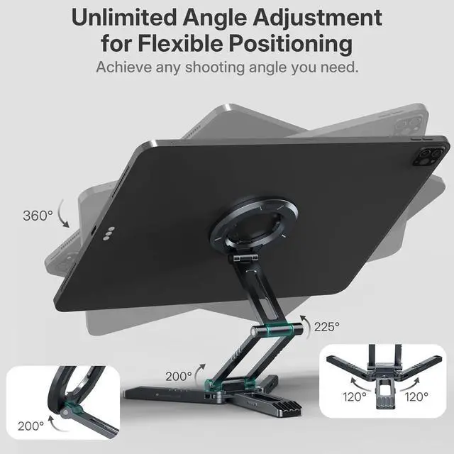 Tri-Fold Adjustable Angles The tri-fold design offers added height extension and a larger, more comfortable grip for ease of use. It adjusts smoothly from 0.69 inches ( 17.7 mm) to a full 10.43 inches (265mm), providing flexible shooting angles with 270° adjustment at each fold. The 360° rotating base further enhances versatility, allowing you to position your phone camera effortlessly for overhead, upward, vertical, and various other shooting angles.