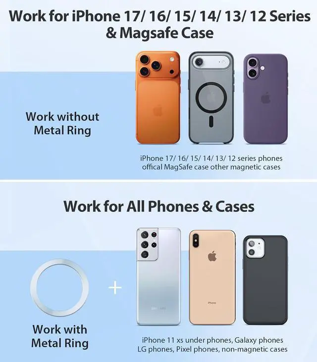 [Work for All Phones] This magnetic car phone holder works for all phones & cases. We provide extra 2 metal rings (Gifts) on this magnetic phone holder for car. Stick the metal ring on the phone or case. The super magnet power of the phone magnet for car holds your phone absolutely still and steadily even on the bumpiest road or cobblestone street. Surprisingly, the hollowed-out ring design of this magnet cell phone holder for car wont block the wireless charging function