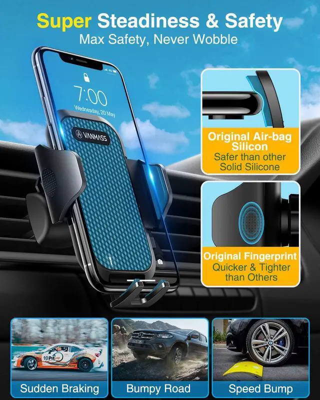 Pro VersionVANMASS' s Best ChoiceVANMASS has been dedicated to car phone holder for 8 years, always leading the car holder industry in all aspects: safety, stability, durability, compatibility, multi-scene adaptability, climate friendly. The pro version mount enables the cutting-edge design team to create the best choice for customers- highest rating, most customers' preference, EU Intellectual Property Patent (No. 007708805-0001), Military Grade Cert (No. GZMR220601855501), CP65/REACH/ROHS