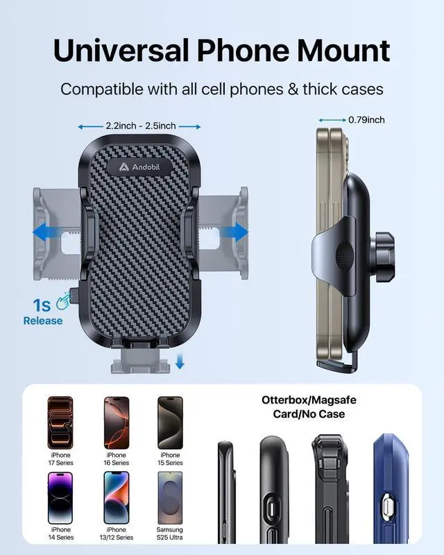 Andobil 3-in-1 Universal Car Mount Your Trusted Driving Companion Join over 90 million satisfied users who trust Andobil for premium quality and innovative design. Our car mount features advanced nano gel suction cups and robust steel core vent clips, ensuring a secure hold on dashboards, windshields, and air vents. Perfectly compatible with various vehicle types, including trucks, SUVs, and cars.