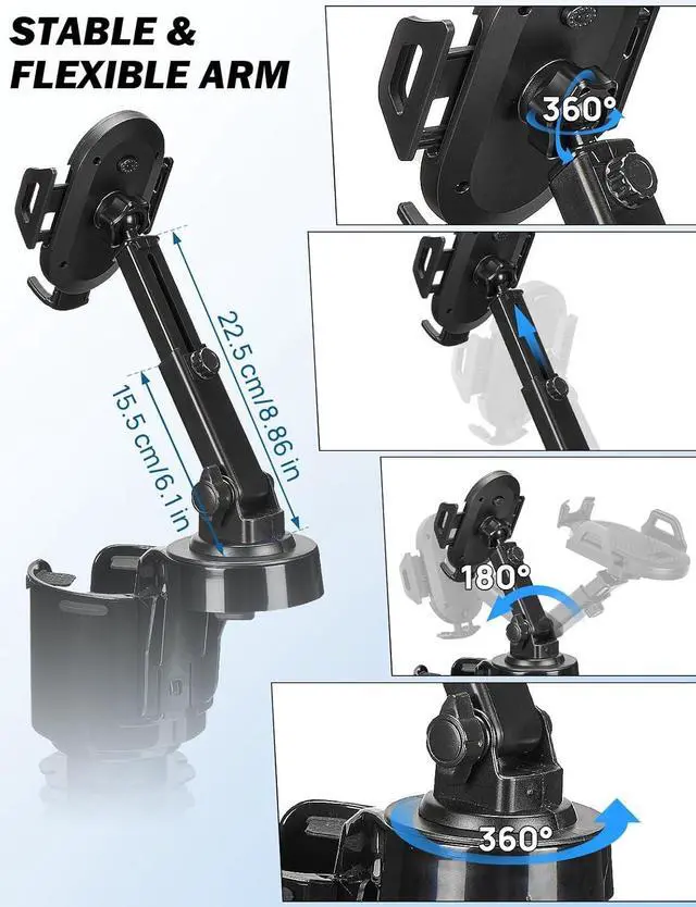 360 Rotatable View & Adjustable Long Arm The car phone mount head could be rotated in 360°, which enables watching navigation app with the screen horizontally. The extandable arm could be extended to satisfy your need and the clip could keep the smartphone from being shaking and accidental drop. You can adjust the distance between you and the holder easily.
