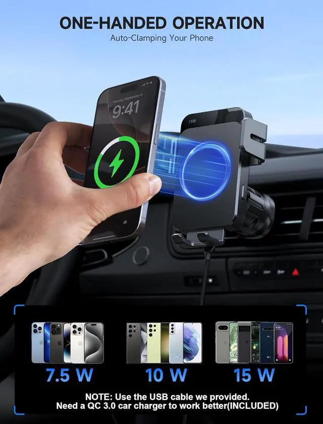 Wide CompatibilityThis wireless car charger mount can compatible with all wireless charging phones (Not compatible with Foldable Phone). 15W Wireless Fast Charging for LG V50/V40/V30/G8 /G7; 10W for Samsung Galaxy S23 Ultra/S23+/S23/S22 Ultra/S22/S21/ S21+/ S21 ultra/S20+/S20/Note 20/Note 20 Ultra/Note 10+/Note 10/S10+; 7.5W for iPhone 16 15 pro plus max/14/14 plus/14 pro/14 pro max/13/13 pro/ 12 Pro Max/12 Pro/12/11 /11 Pro /11 Pro Max /SE /XS /X/XR/8 Plus/8; 5W standard wireless charging for other wireless car charging Phones.