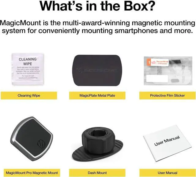 s Included: The Scosche MagicMount Pro magnetic car phone mount comes with a MagicPlate, and clear install instructions. Backed by Scosches Lifetime Tech Support and 3-Year Warranty, because we stand behind every mount