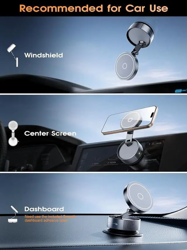 [ExpertHolder ProMagSafe-Ready Car Mount]Designed for precision and performance, this car mount features a 360° rotatable magnetic dock and dual-axis adjustment for perfect positioning. Built with automotive-grade materials and tested to military stability standards, it locks your device into place with a certified snap-fit. The extendable arm, equipped with fine-tune adjustment knobs, adapts effortlessly to your cars layoutwhether you' re setting up a focused driving command center or enjoying a more immersive, hands-free experience with safer, optimized viewing angles.