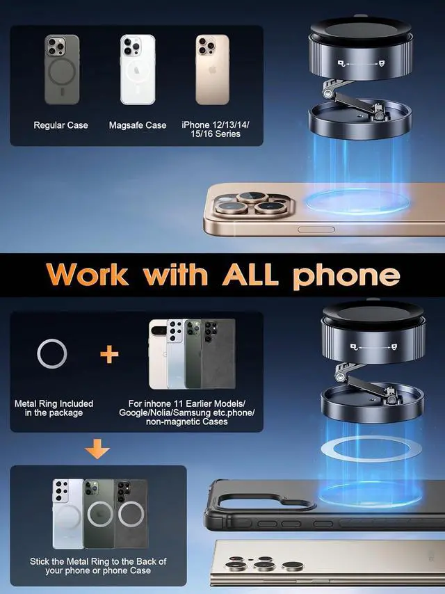 [Universal Compatibility & Quick Setup]The mount is compatible with iPhone 16/15/14/13/12 series and For all MagSafe-enabled devices. For non-MagSafe phones, it includes a magnetic ring to ensure a solid magnetic hold. Installation is a breezejust snap it into place in seconds with one hand. Its perfect for different car models and ensures a secure fit for every device.