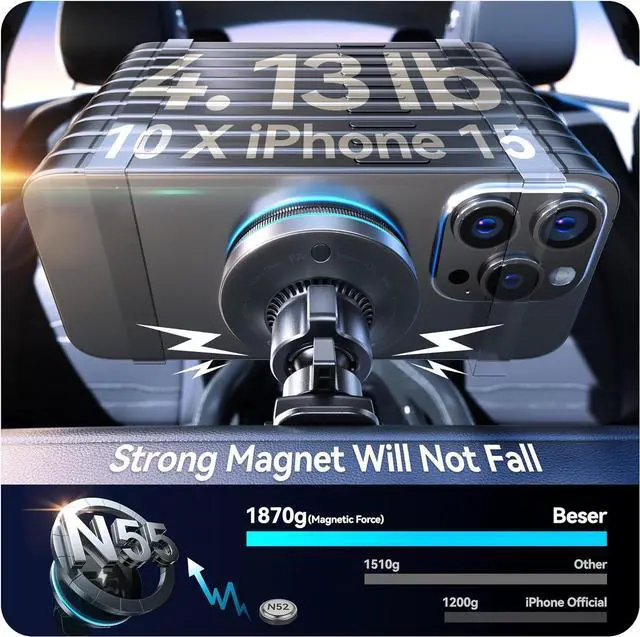 Strong Magnetic Hold: Featuring 18 powerful N55 magnets with a maximum force of 4.13 lbf (1870 g), this mount can securely hold up to 10 iPhone 15 (172g each). It prevents your phone from falling, ensuring safe driving, even on rough terrains.