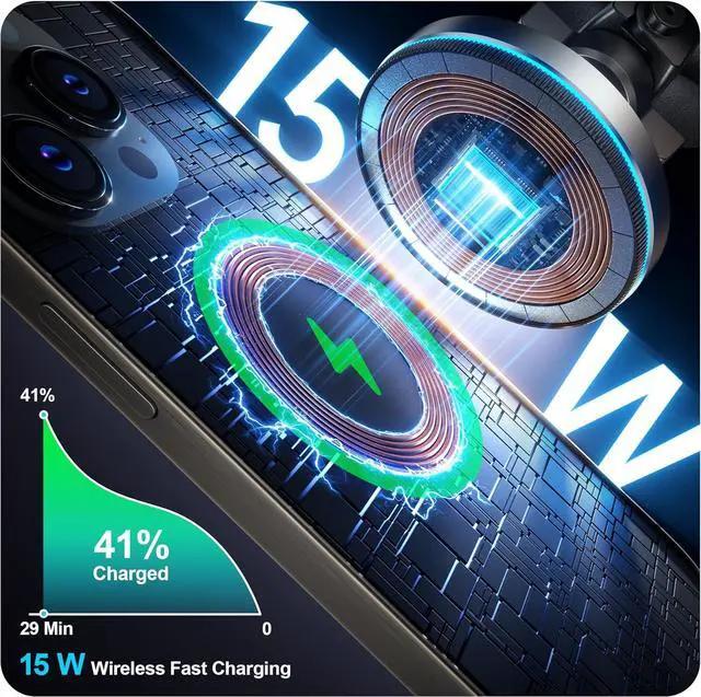 15W Safe Fast Charging: For magsafe car mount charger uses a BeserQI smart chip for 15W-Ultra fast charging, giving you 41% battery in just 29 minutes. For the best charging experience, it is recommended to use a QC 3.0 car charger (not included);