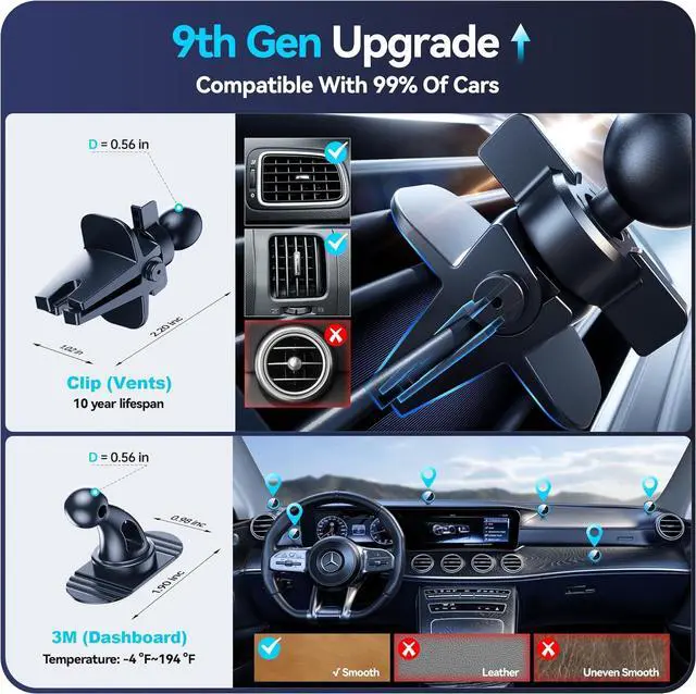 Car Compatibility: Fits 99% of cars, usable on air vents or dashboard. The upgraded ' eagle claw' clip ensures 200% more stability. Includes a strong ballhead mount (3M) for the dashboard.
