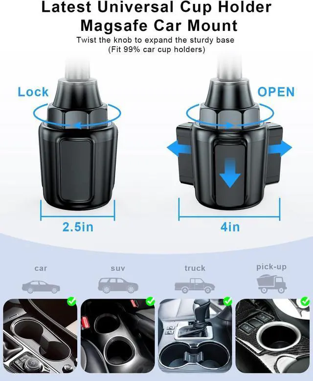 [Wider Expandable Base] The expandable cup holder base between 2.4 -4 inch. You can use the multi-purpose phone mount for most cars, trucks, SUVs, boat cup holders, and other devices with a round cup holder.