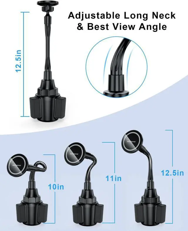 [Upgrade Solid Gooseneck] The 12.5 in long Gooseneck of this magnetic phone car cup holder can be adjusted as you wish. It is designed with Aluminum alloy and center shaft structure, making the neck very durable. Besides, the top of the pole has 360° rotation ball joint.