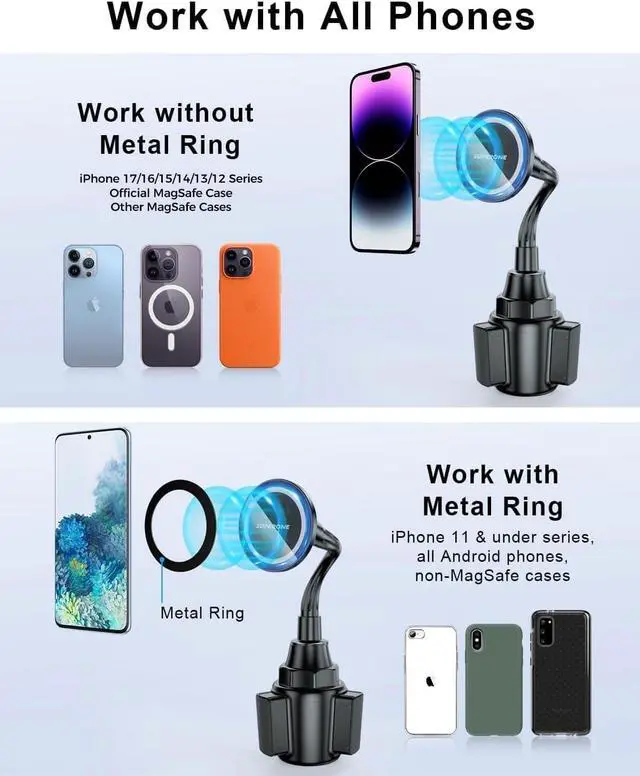 [Work for All Phones] Compatible with iPhone 17/16/15/14/13/12 series & All MagSafe Cases, without the hassle of sticking metal ring. * Compatible for