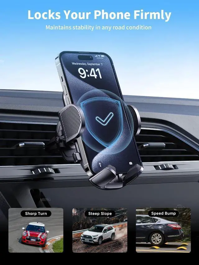 Upgraded Air Vent Clip Nycetek car phone holder adopts the latest double-lock structure air vent clip, which can firmly lock the air vent. Reduces shaking and prevents the car mount from falling.