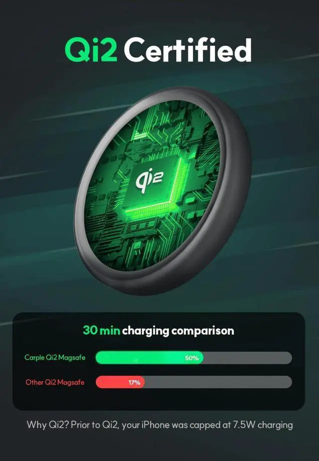 Qi2 15W Certified: Officially Qi2 Certified for rapid charging. Go from 0 to 50% in just 30 minutes and achieve a full charge in under 2 hours with the Carple The Mount Magnetic Charger.