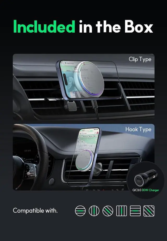 All-in-One Package: Everything you need is included Carple The Mount magnetic charger, 30W QC 3.0 car adapter, USB-C to USB-C cable, clip-style and hook-style vent mounts, and a user manual. No extra purchases neededjust unbox and start charging.