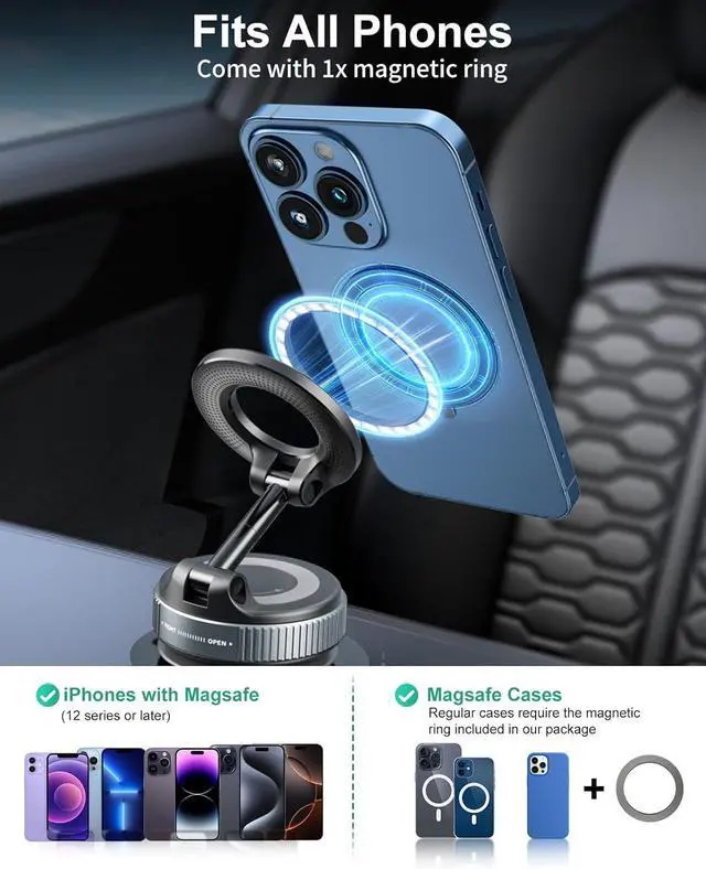 [ Magnetic Strength and Phone Security ] The foldable vacuum magnetic phone with 24 high-performance N55 magnets, snapp onto the mount with a satisfying click and remained firmly in place, even on bumpy roads, without wobble or slippage, give you confidence in the phone' s security. This strong magnetic connection is crucial for hands-free navigation and calls while driving. For Android phones without MagSafe, require to attach the metal ring.